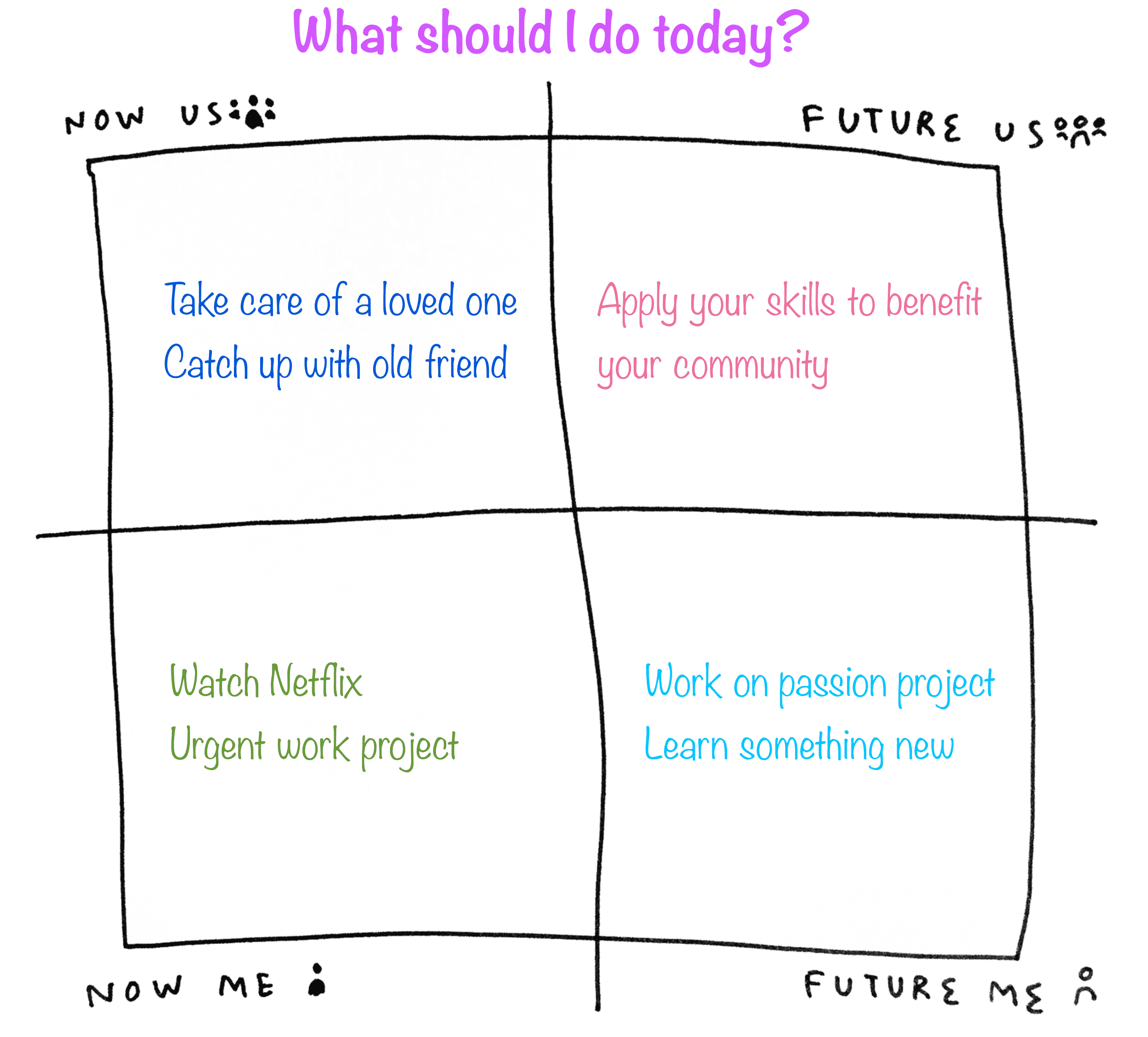 “Now us” (your short-term group-minded self) might want to talk with a family member going through a hard time, or reconnect with an old friend.