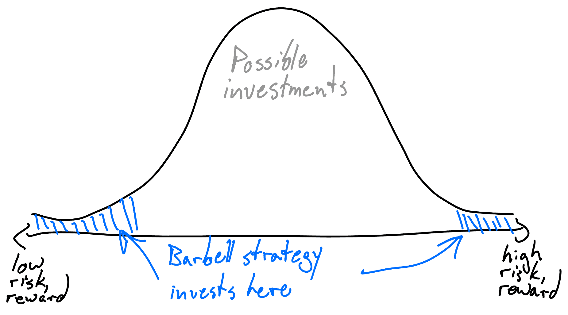 Imagine a menu of investments ranging from low-risk & low-reward to high-risk & high reward. The barbell strategy picks mostly conservative low risk investments to cap losses, and a few high risk bets in the hopes of outsized payoffs. It ignores middle-of-the-road investments.